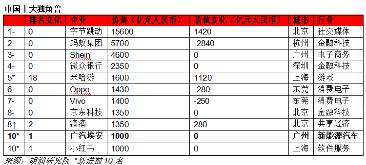 三是21家国企孵化的独角兽上榜,全部来自中国,以广汽埃安为首,价值达1000亿元人民币;其次是岚图,价值达305亿元人民币;智己汽车、积塔半导体价值均达300亿元人民币。