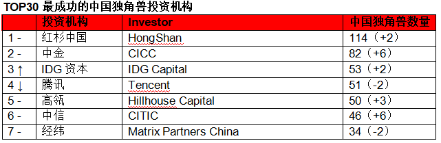 此外,老虎环球首次获得“全球最成功的独角兽投资机构”称号,投资了205家独角兽企业。红杉中国全球排名第三,并成为最成功的中国独角兽投资机构,投资了114家中国独角兽企业。