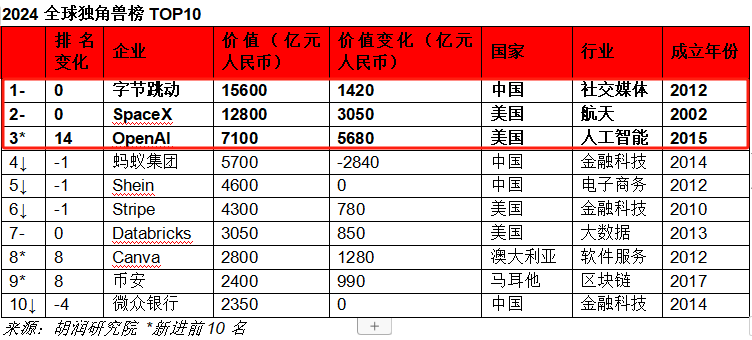 胡润百富董事长兼首席调研官胡润分析,过去一年,字节跳动仍是全球价值最高的独角兽,但是OpenAI的价值增长最快,其次价值增长明显的是SpaceX。