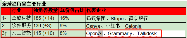 榜单中,美国拥有近一半的独角兽企业,主要来自软件服务、金融科技和AI行业;中国拥有四分之一的独角兽企业,主要来自AI、半导体和新能源;世界其他地区拥有另外四分之一的独角兽企业,主要来自金融科技和电子商务。