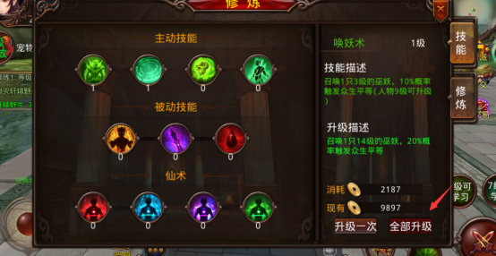 做完前几个任务,等级提升到3级,打开修炼面板,学习初始技能