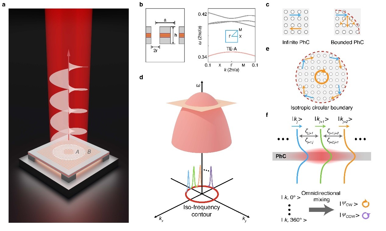 研究团队从实空间与动量空间的傅里叶对偶性出发,设计了一种圆形边界的有源光子晶体。在圆形边界散射效应作用下,原本独立传播的多个光子晶体导模发生各向同性耦合,进而形成二重简并的集体导模共振态(collective guided resonances,CGRs)。在保持镜面对称下,两个简并模式携带相反的手性涡旋。进一步,团队利用非对称泵浦技术破缺手性对称性,实现了手性涡旋激光的单模激射。团队成功观测了实空间中心处强度为零的涡旋光束,并通过偏振分布及自干涉测量证实涡旋中心处纯粹相位奇点,体现为自干涉条纹呈现为一对朝向相反的“叉”(fork)型图案。上述结果证实了激光光束携带非零的手性轨道角动量。