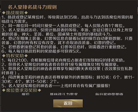 被选入名人堂的神选者们将拥有属于自己的各项特权,比如在圣殿中修改自己的名人堂雕像,个人信息界面限时战斗力排行等等,巅峰挑战还增加了3个名人堂相关成就,完成后将奖励3个称号。黄金圣殿的玩家还会有自己专属的聊天表情,黄金圣殿的第一名登陆游戏时还将拥有自己独特的世界频道通报提醒。每天晚上九点,系统还会根据席位排名向名人堂的玩家们发放相应的排名奖励。