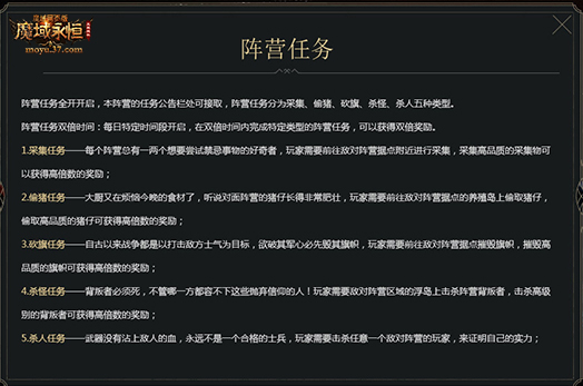 在新版本中,玩家达到一定等级,即可自行选择所属阵营,37《魔域永恒》为玩家提供了两大阵营选择—[圣耀]和[暗影]。在阵营战斗中,玩家可以领取各自阵营发布的任务,帮助自身阵营势力完成委派任务,获得相应奖励。