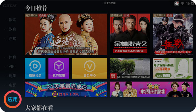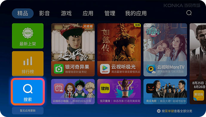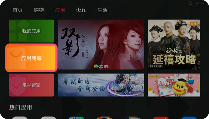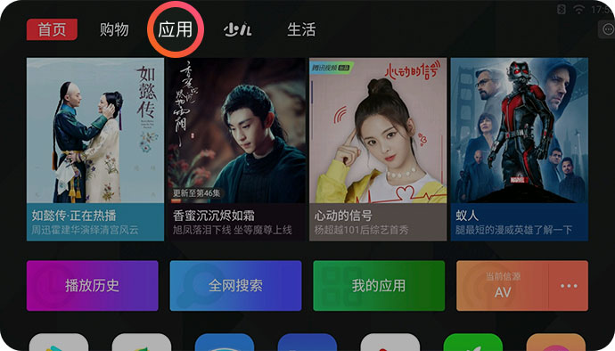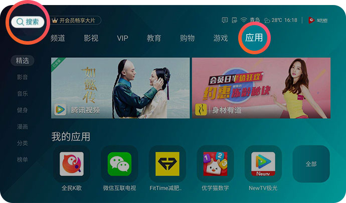 1打开电视,进入“应用”后点击左上角“搜索”。