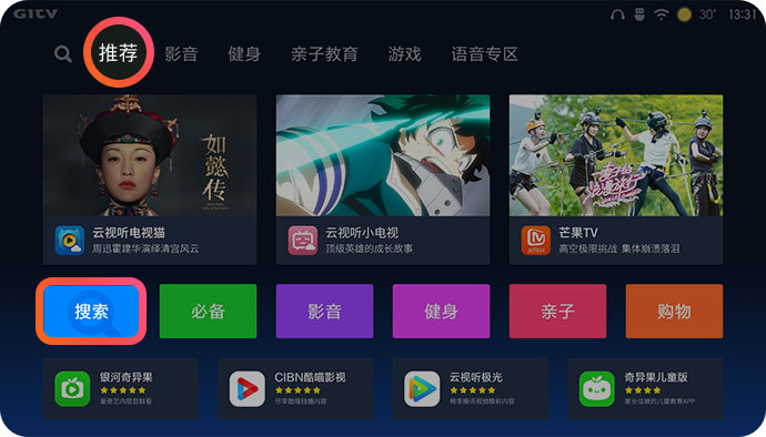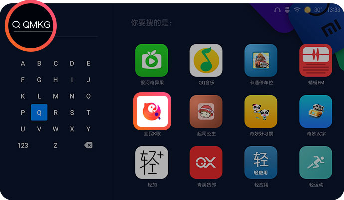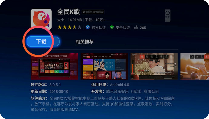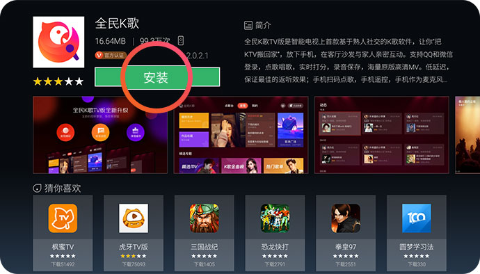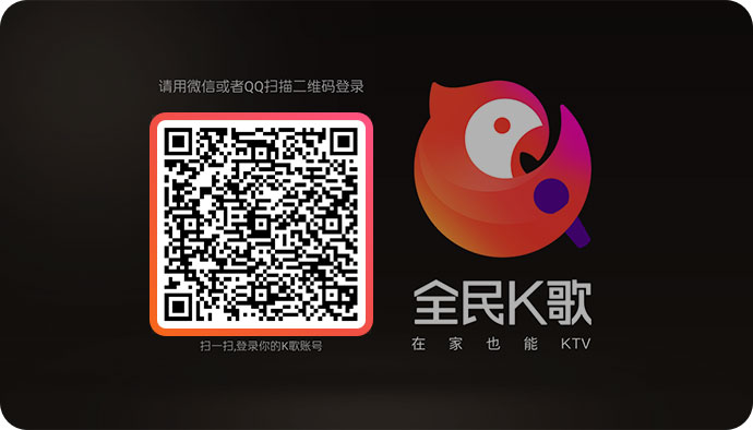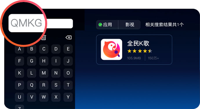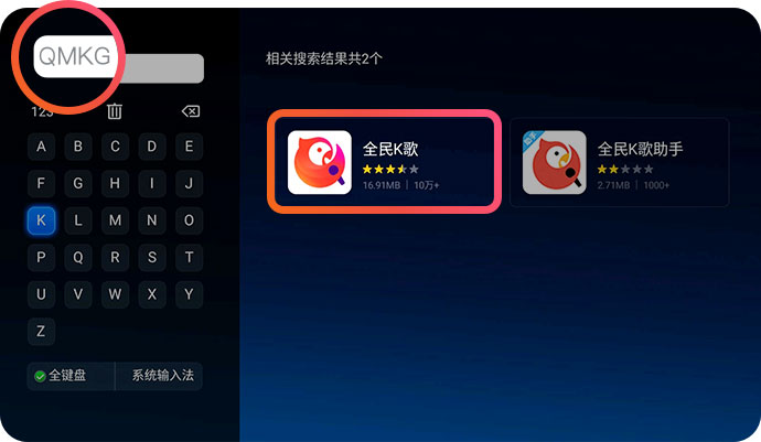 方法一在智能电视/盒子的应用商店中搜索全民K歌首字母QMKG即可下载安装,并用微信或QQ扫码登录。
