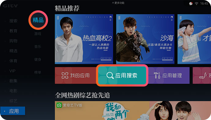 2选择“应用”菜单下方的“精品”栏目,并在其中找到“应用搜索。