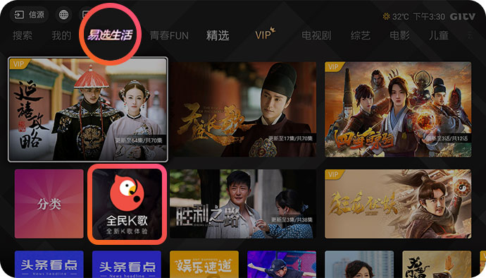 1打开电视,选择“易选生活”,并进入“全民K歌”。