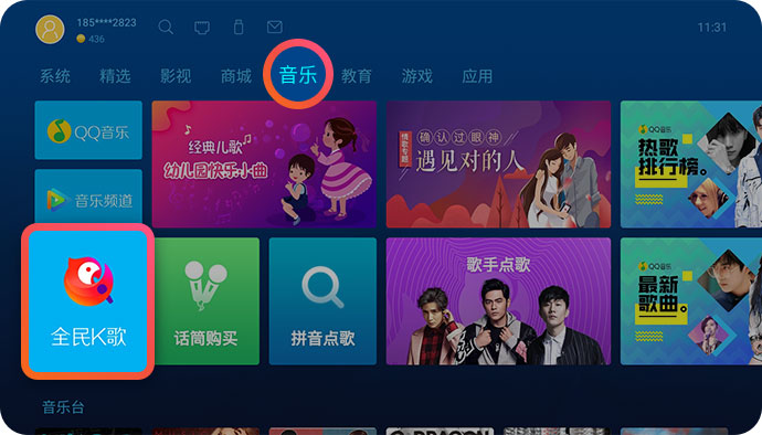 1打开电视,魔域世界顺网选择“音乐”,进入“全民K歌”。