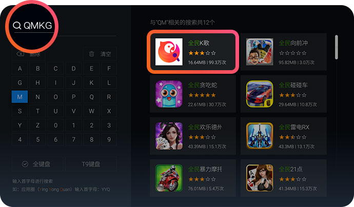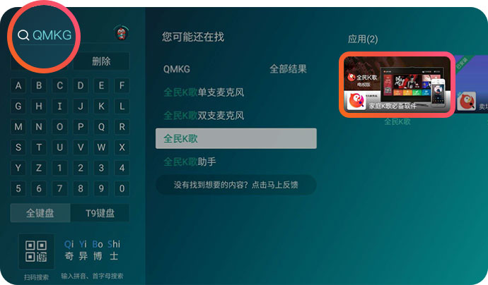 2输入全民K歌首字母“QMKG”,在右侧选择全名K歌应用并进入。