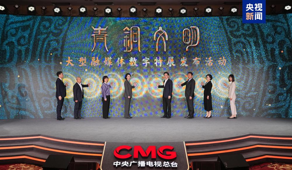 △中央广播电视总台华语环球节目中心主任麻静、保利文化集团董事长王波、上海博物馆党委书记汤世芬、山西博物院副院长梁育军、河南博物院副院长张得水、宝鸡青铜器博物院院长宁亚莹、湖北省博物馆副馆长何广、三星堆博物馆副馆长董静共同发布《青铜文明》大型融媒体数字特展