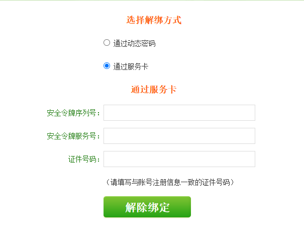 ④点击选择解除绑定,此时您可以通过动态密码或者服务卡(购买时附带的实体卡,刮开涂层有16位的服务卡号)进行解绑操作。