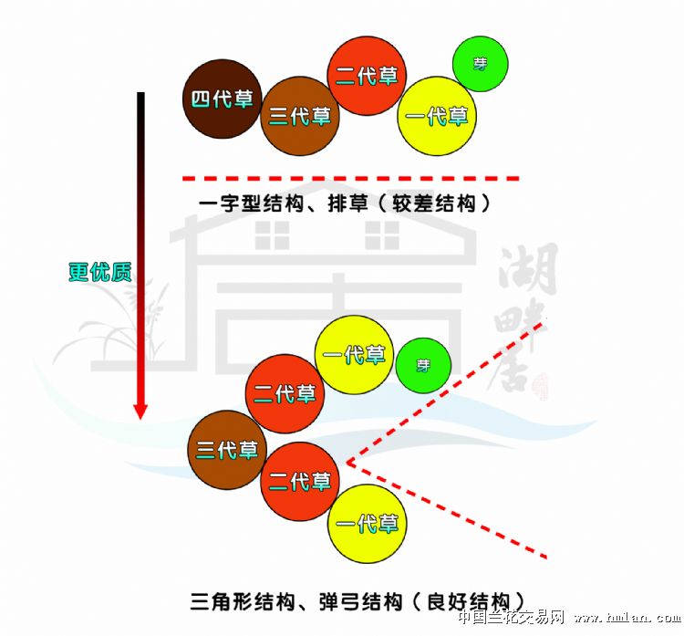 一般惯例称:1代2代连体为子母草,1代3代连体为爷孙草,以此类推。但同样的2苗草或者带芽的草都有优有劣。一般是新草越大就越好,新草越大,分下之前营养供给越充足,后期生长也越好,发的苗也越大。请看示意及态势。