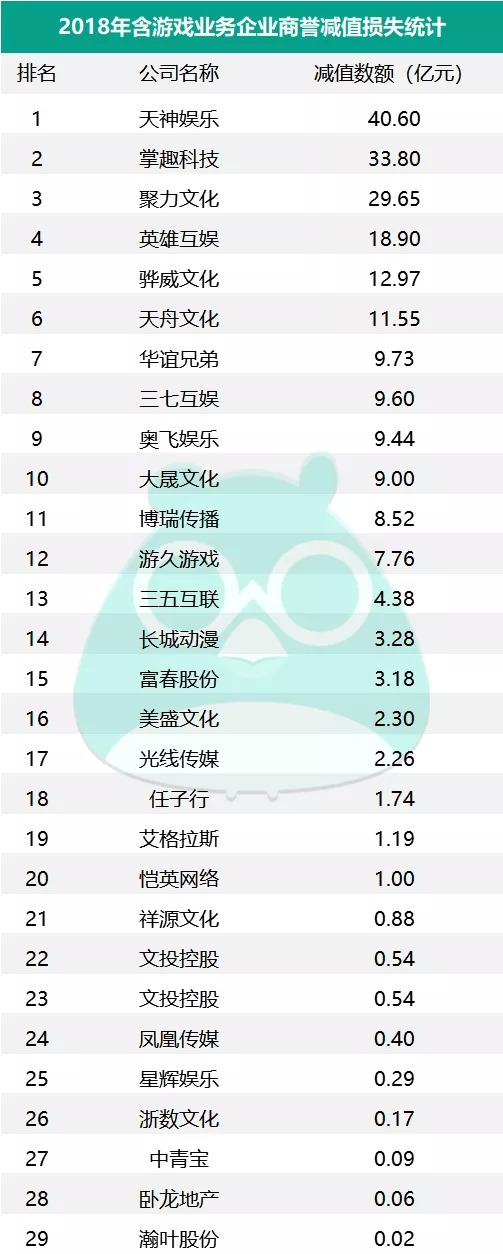 在经历过2013年至2015年并购重组狂潮后,商誉地雷在2018年开始频繁爆炸,曾溢价几十倍收购游戏公司以粉饰业绩的传统行业上市公司亦难逃一劫。由于游戏子公司未达到业绩承诺或经营不善导致母公司亏损的情况频频出现。据财报显示,2018年共有29家企业出现商誉减值,其中减值数额逾1亿元的企业共计20家,减值金额最高达40.6亿元,同时亏损情况最为严重的10家公司均与商誉减值有密切联系。