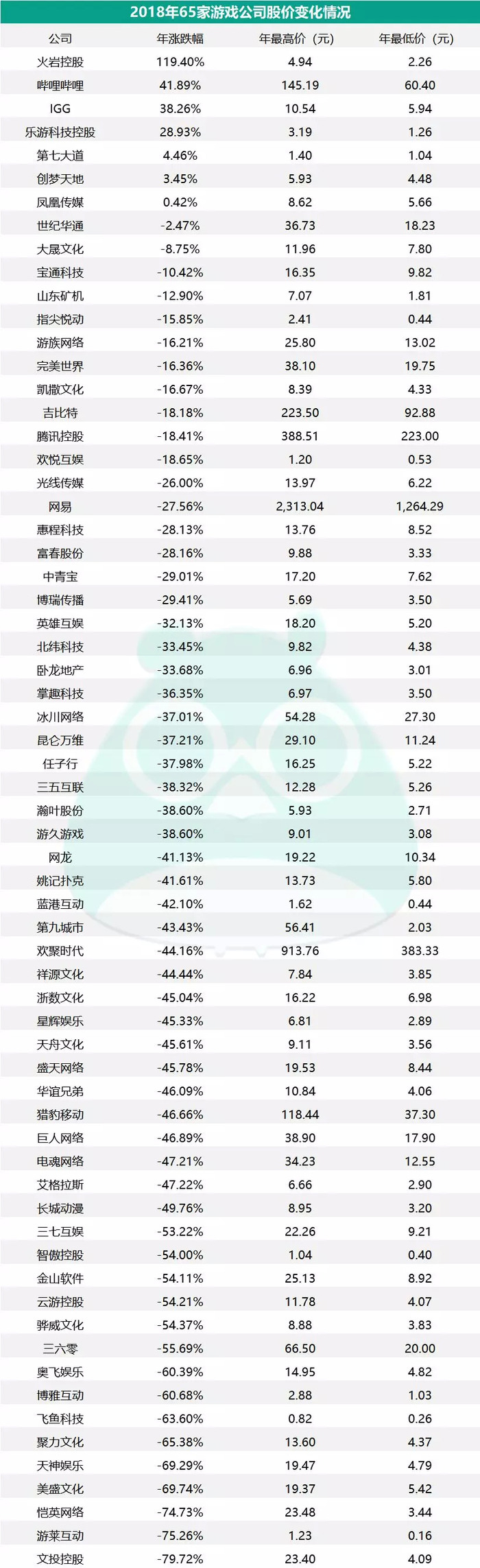 据统计,2018年全年股价跌幅逾50%的公司共计15家,其中恺英网络、游莱互动以及文投控股跌幅均达70%以上;腾讯与网易股价分别下跌约18%与28%。