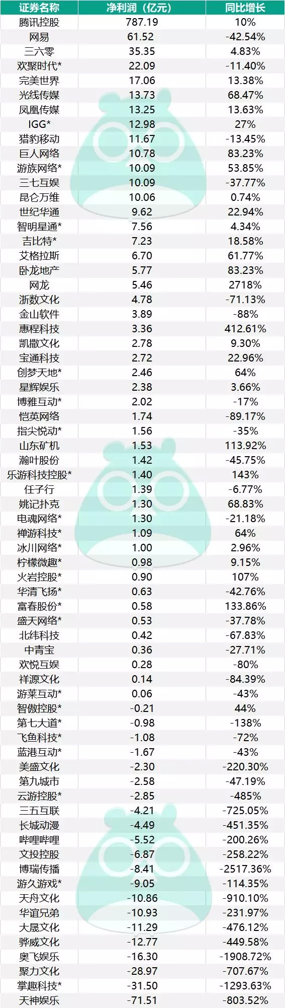2018年归母净利润逾10亿元的公司共13家,除腾讯网易以外还有三六零、欢聚时代、完美世界、光线传媒、凤凰传媒、IGG、猎豹移动、巨人网络、游族网络、三七互娱以及昆仑万维。
