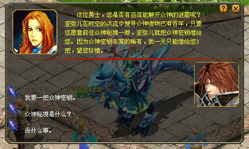 1、每天可以在众神秘境使者 亚弥儿处领取3把众神密钥,一次只可领取1把,消耗后可再次领取。