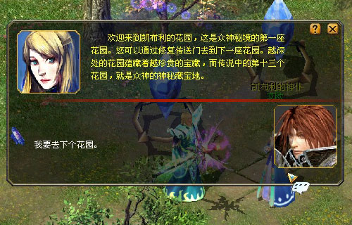 来到了众神秘境的第一个花园。一位神仆出现在面前。原来,众神秘境是由12座花园组成,完成神仆交代的事情,就可以前往下座花园。为了探究众神的秘密,努力吧!