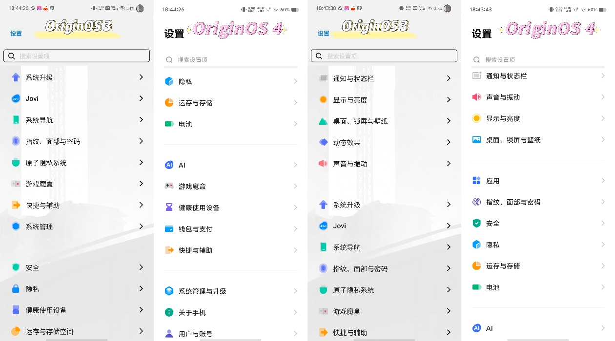 另外OriginOS 4将设置页面菜单重新进行了整理与分类,使得OriginOS 4在设置选项上更靠近原生Android系统,即使是刚买手机也能快速上手,上图为调整的详细位置,大家可以看看熟悉一下。