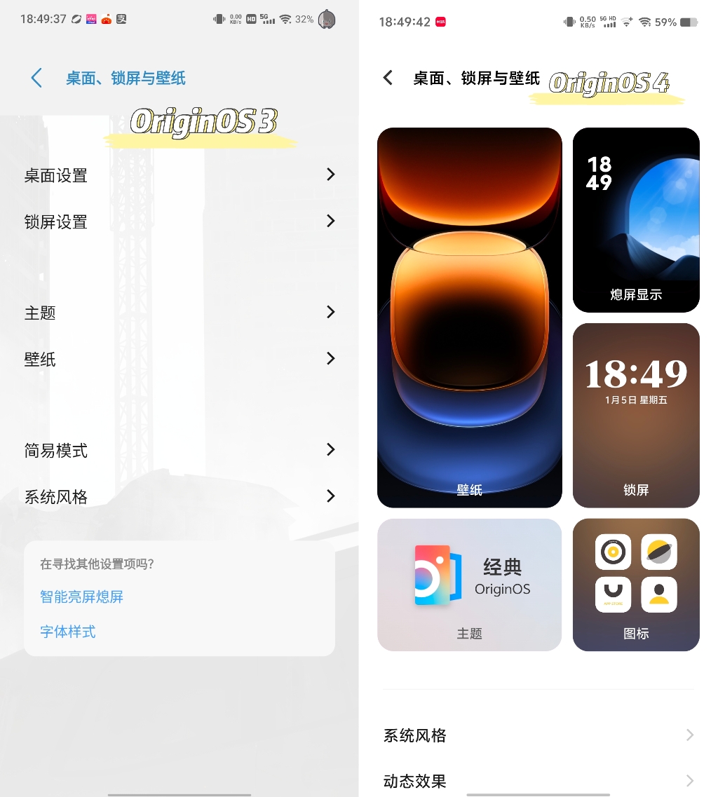 通过对比OriginOS 3与OriginOS 4桌面、锁屏与壁纸页面可以看出,相较于OriginOS 3的纯文字页面OriginOS 4修改为了图文结合的页面,看起来非常舒服,设置起来也非常方便。