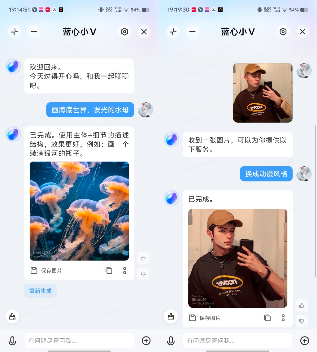 蓝心小V其实还是一名画家,它可以通过你的文字描述来画出一幅精美的作品,另外你还可以发给它一张照片,它可以将你发的照片画成各种风格,随便选一张都能作为头像。