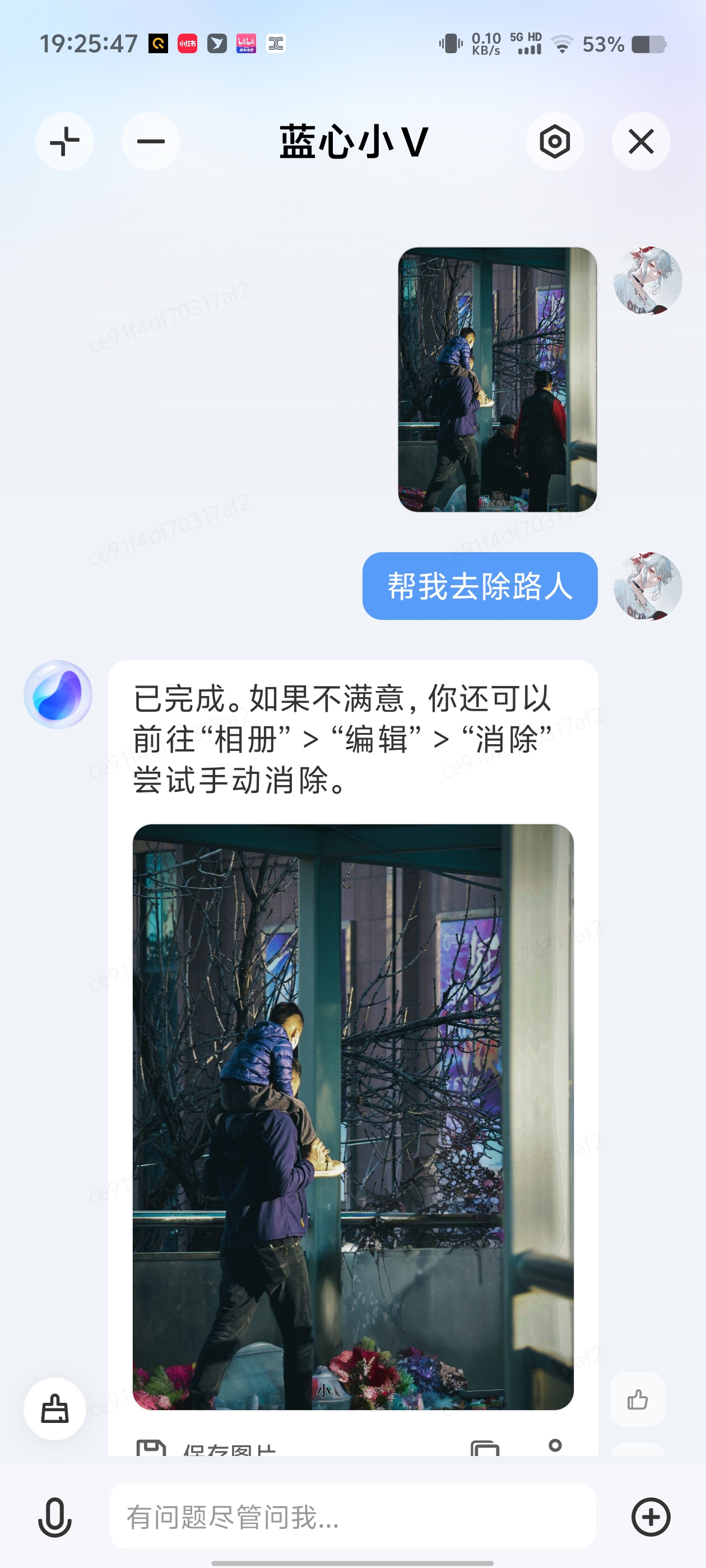 它还能变成一名ps小助手,帮我去除图片中多余的路人,将我的照片修饰的更加美观,另外它修完照片还能帮我配一份文案发朋友圈,真的带来了很大的便利。