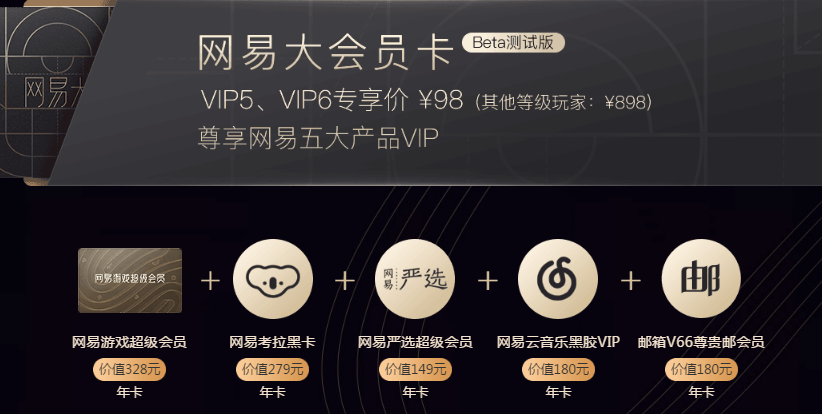 V5、V6会员专享:98元超低价购卡VIP5、VIP6玩家98元超低级购买网易游戏超级会员并升级为大会员,可同时获得网易云音乐黑胶VIP、网易邮箱V66会员、网易严选超级会员、网易考拉黑卡等4项网易产品VIP的年卡服务,无需任何额外费用。这5项会员年卡的单价总计超过1116元,绝对物超所值。而俱乐部其他等级用户也可以898元购得大会员年卡。