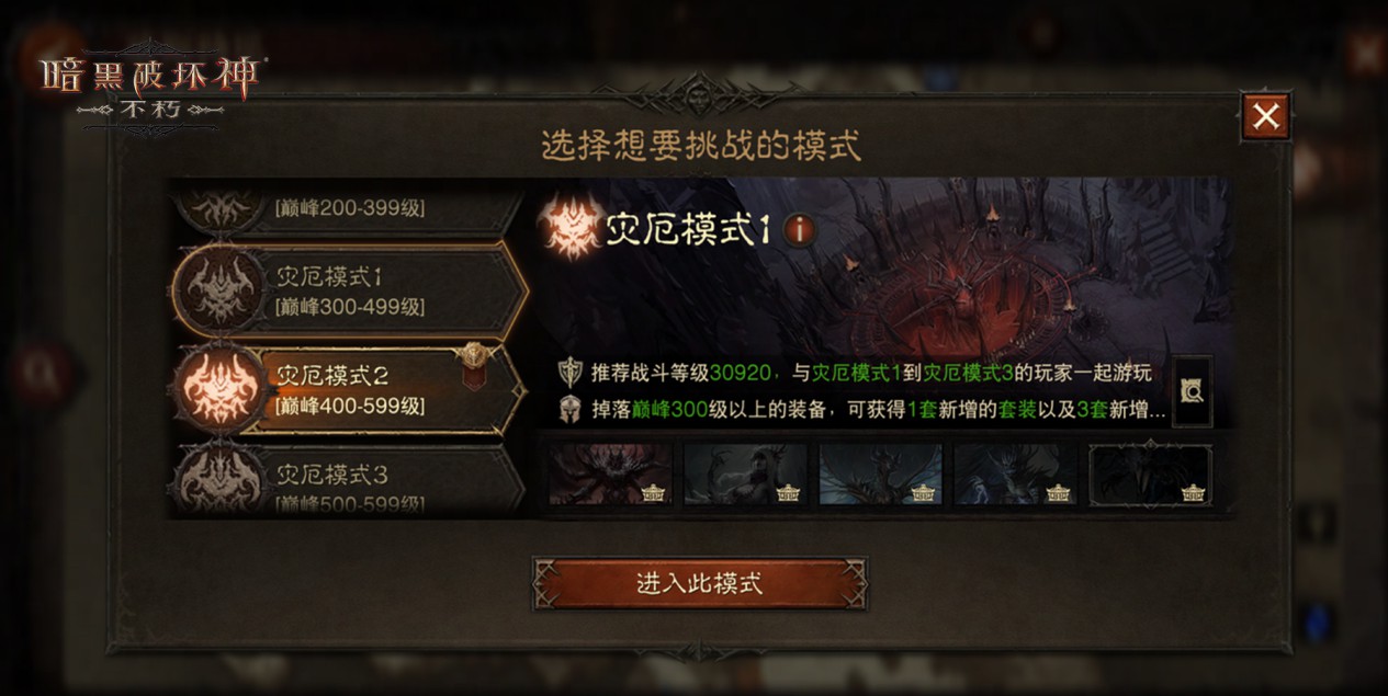 灾厄模式,征程再起!勇往直前,向着更大的挑战进军!庇护之地上的风波尚未平息,新的强敌在黑暗中蠢蠢欲动。现在登录《暗黑破坏神:不朽》,击败对应等级的魔神,即可解锁灾厄模式1、2、3,且解锁灾厄模式的玩家可一同游玩,体验合作对敌的乐趣。不仅如此,新灾厄模式还带来了更多更丰富的内容:八大职业均新增一套传奇装备,让玩家可解锁更多BD,创造更多可能;全新套装【严冬祈祷者】上线,以“寒冷”机制为核心,点亮全新灵感!冒险永不停息,即日起,打开灾厄的大门,迎接全新的挑战!
