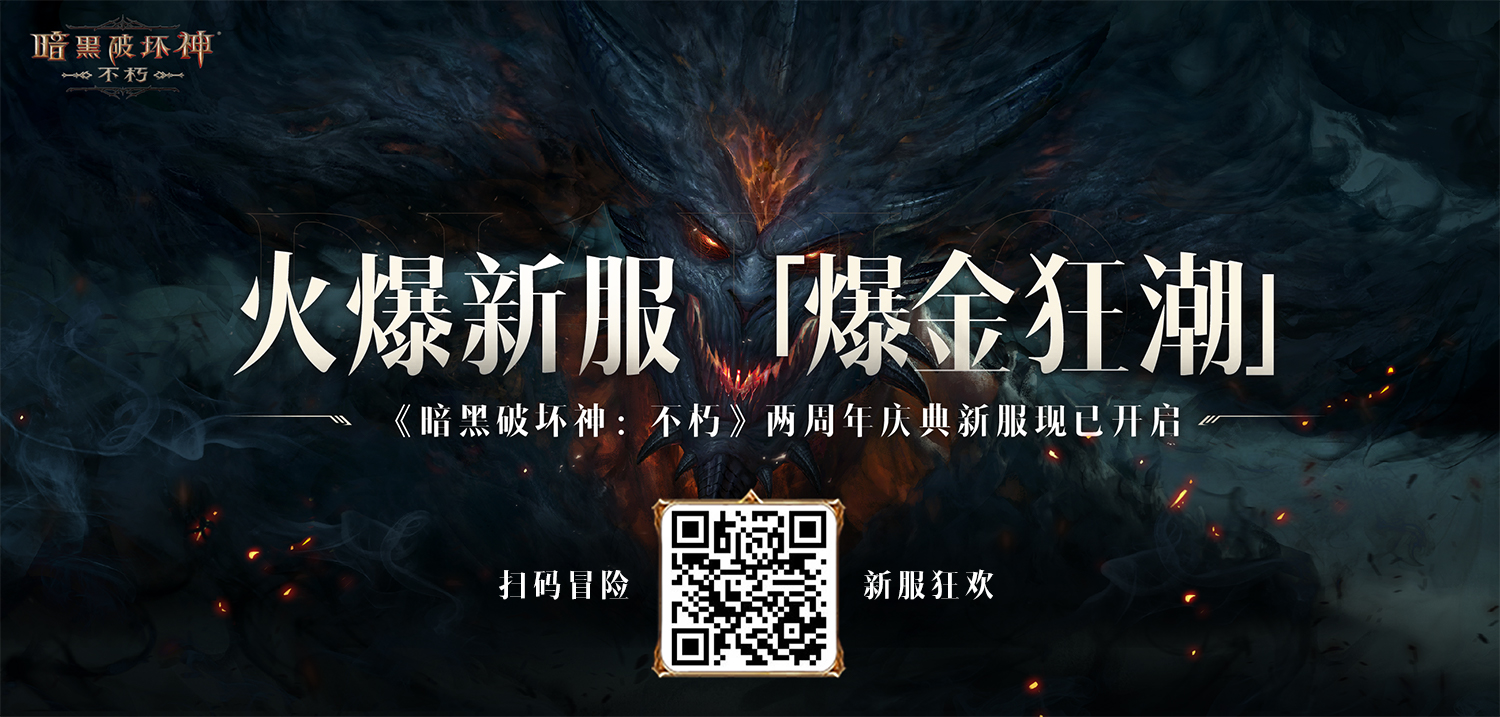 庆典开启,火爆新服!两周年庆典降临,游戏内外的超多大礼正等待玩家们获取!《暗黑破坏神:不朽》两周年庆典服务器【爆金狂潮】今日正式开启。现在前往新服,就能参与周年庆盛大庆典活动,斩获海量惊喜大礼。同时冒险者们完成任务,提升等级,还能获得抽取幸运大奖的机会。扫描下方二维码即可参与新服抽奖活动,有机会将邮政礼盒、Zippo定制打火机、永恒荣耀礼盒、纪念徽章、大菠萝帽子和角色典藏卡在内的珍稀奖励收入囊中。盛典开启好运连连,让幸运奖励助你冒险!