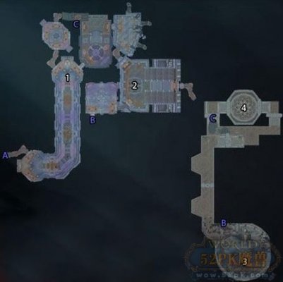 A为入口,打完所有BOSS后从C处跳下出副本,1 2 3 4分别是4个BOSS的位置