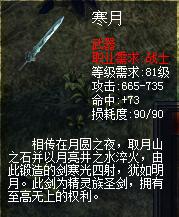 名称:寒月;职业需求:战士;类型:武器;等级需求:81级;相传在月圆之夜,取月山之石并以月亮井之水淬火,由此锻造的剑寒光四射,犹如明月。此剑为精灵族圣剑,拥有至高无上的权利。精灵一族,以精巧唯美流传于世,寒月剑为精灵族圣剑,精巧之处不必多言。而且此剑为精灵一族的圣剑,想要完全掌握此剑的勇士,必定要得到精灵一族的认可方可。