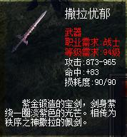 名称:撒拉忧郁;职业需求:战士;类型:武器;等级需求:94级;紫金锻造的宝剑,剑身萦绕一圈淡紫色的光芒。相传为秩序之神撒拉的佩剑。作为创世神创造出的管理主神之一的秩序主神,撒拉的本身实力无需多言,其所带的佩剑也非一般兵器所能比拟,可以说也是一件绝世神兵!