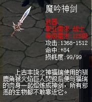 名称:魔吟神剑;职业需求:战士;类型:武器;等级需求:125级;上古丰饶之神福瑞使用的驯鹿角被火焰巨人焚毁后便与福瑞的肉身一起熔炼城神剑,所有邪恶的生物都不敢靠近它。曾经风靡一时的紫色套装,这把剑,可以说是代表了一个时代,而剑本身的来历也非同凡响,此剑居然是神的肉身融合而成,神圣气息必然强大无匹,邪恶生物避让不及就会化为乌有。对于和我差不多的骨灰级玩家来说,这把兵器并不陌生,在我刚开始玩魔域的时候,还是战法天下的时代,就很向往这把兵器!随着岁月的流逝,这把神兵已不如当年火热,但是属于他的辉煌将被铭刻在时间之柱上,永远不会消失。