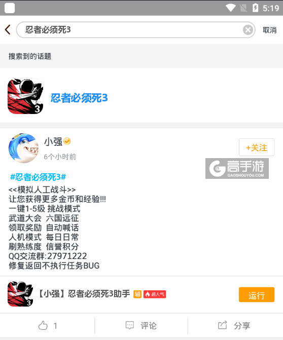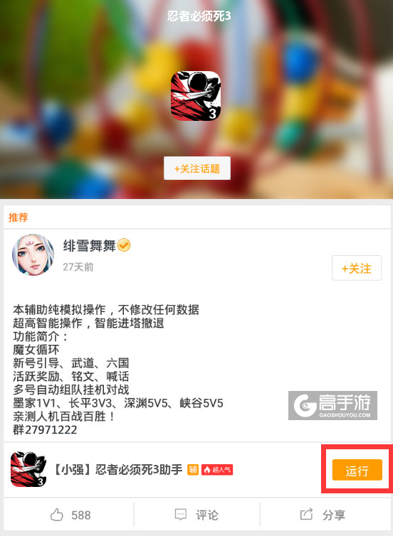 最后,关于此款忍者必须死3辅助工具软件如果在使用的过程中有什么不满意的地方或者有需要改进的地方可以关注我们的微信公众号(gaoshouyou)提问或者在下方留言给我们,我们会即时更新并处理。我们会认真对待您的每一条评论,并反馈给脚本作者,以便提升您的游戏质量。