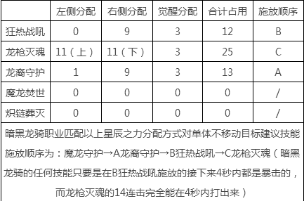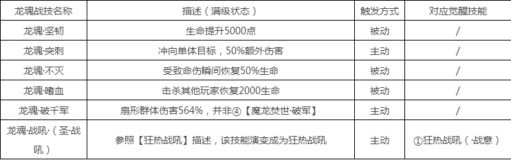 暗黑龙骑除了上文所提及的诸多优点外,还有一个特别实用的被动技能,这个技能就是——龙魂·不灭!在“黑水幽岛”或者“雷炎禁地”,哪怕别的职业都牺牲了,大龙骑还能瞬间恢复50%的生命,很有可能收割boss,可谓是“一枪定乾坤”!也许其他任何职业的技能都跟本体宠的养成评分没有关系,但是龙骑不同,龙骑有一个专属的本体“龙魂战技”技能集合,其对应关系参照下方表格,从下面的表格中我们不难总结出一句话——暗黑龙骑为PK而生。